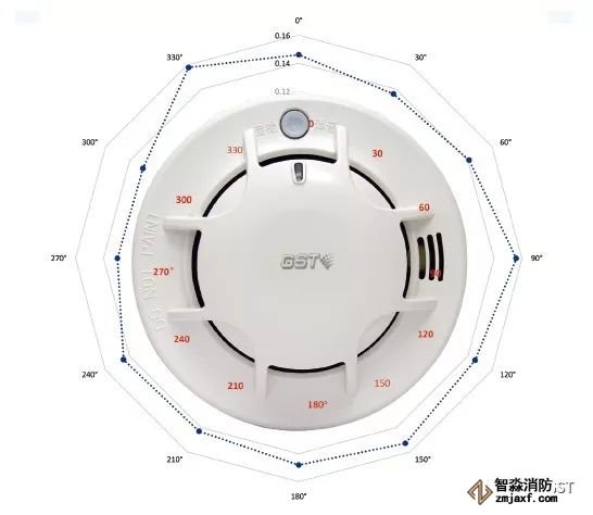 各個方位報警響應(yīng)均勻。方位試驗結(jié)果(最不利和最有利方位報警閾值之比)為1.22,遠小于國家標準(小于1.6)要求。